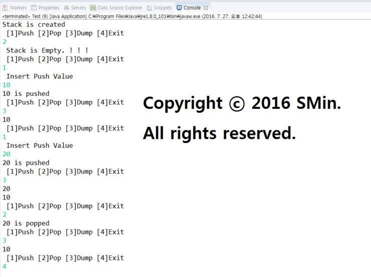 class Stack { // [1]push [2]pop [3]dump [4]exit 로 만들것임.
