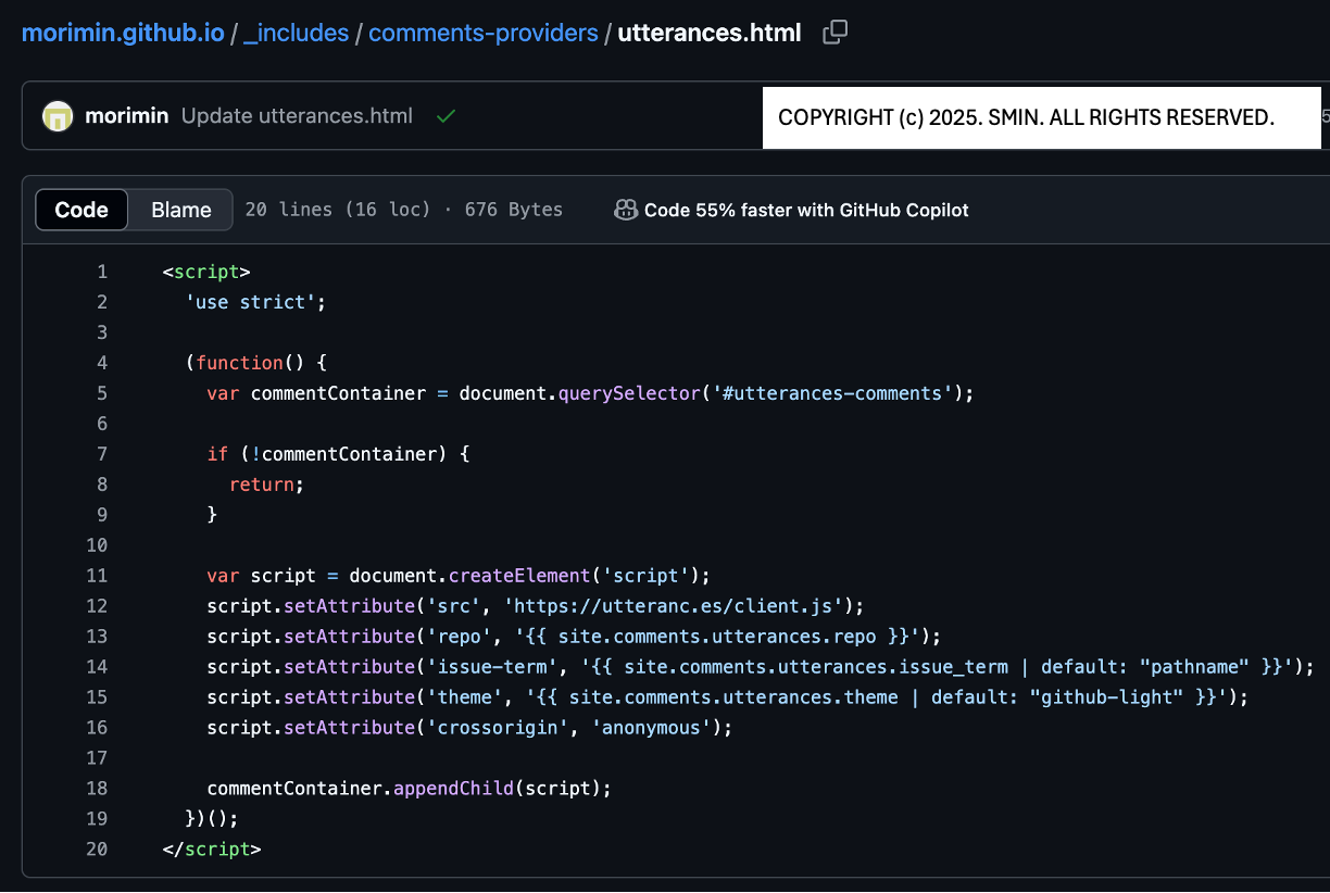 6. _includes/comments-providers 밑에 utterances.html 을 생성하고, 아래 내용을 입력 해 준다.