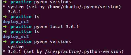 pyenv install 3.6.1을 설치한 뒤 pyenv versions를 해보면 system이 메인 python이라면, pyenv local 3.6.1을 실행해 로컬폴더의 파이썬 환경을 3.6.1버전으로 바꿔준다.