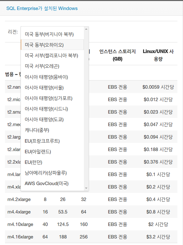 요금제를 살펴보면 지역에 따라, 운영체제에 따라, 인스턴스 타입에 따라 가격이 달라진다.