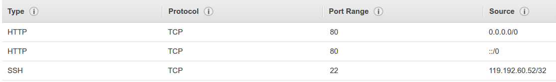 80번 포트가 지정되어 있지 않다면 사용자들은 웹서버로 접속할 수 없다. 만약 설정되어 있지 않다면, Security Group - Inbound에서 Type이 HTTP이고 Port Range가 80번을 설정해줘야 한다.