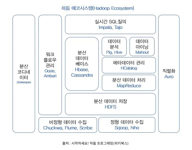 - 하둡의 서브 프로젝트 : 나머지 프로젝트들 -> 워크플로우 관리, 데이터 마이닝, 분석, 수집, 직렬화 등등