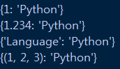 1-1. key 값에는 리스트와 딕셔너리를 제외한 자료형이 가능합니다.