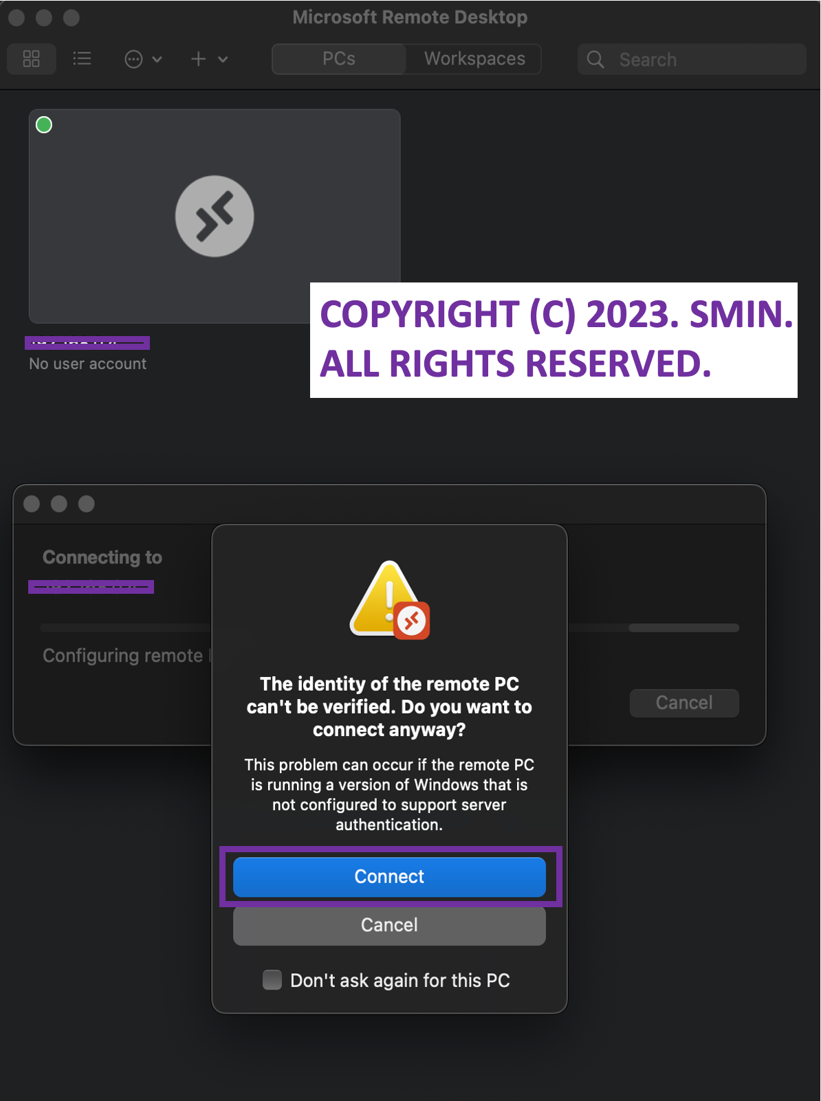 9. 접속을 계속할건지 물어보는데, 'Connect' 를 눌러 진행하자.