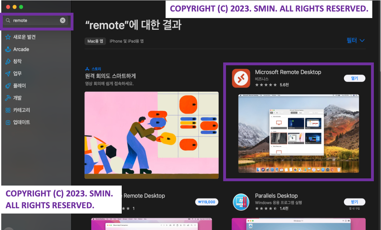 5. 앱스토어에 접속하여 'remote' 로 검색하면 'Microsoft Remote Desktop' 을 다운받는다.