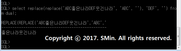 SELECT REPLACE( REPLACE( 'ABC좋은나라DEF웃긴나라' , 'ABC' , '') ), 'DEF', '')